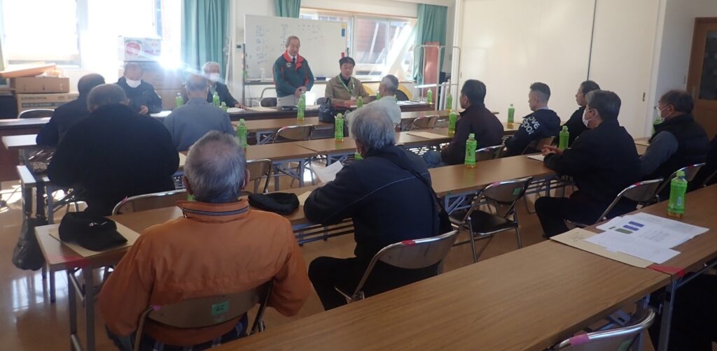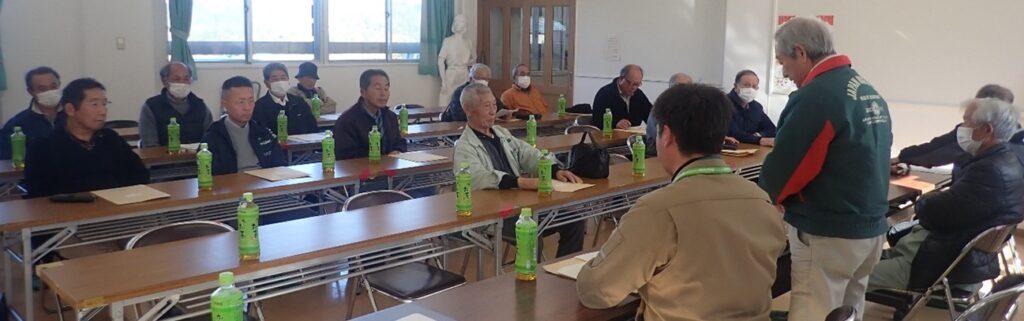 根知・小滝地区の代表者様、森林組合総代様にお集まりいただき、森林林業を取り巻く環境の変化、これらの動向などについて説明・相談の機会を設けさせて頂きました。