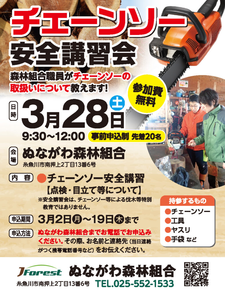 お知らせ HOME>お知らせ>チェーンソー安全講習会 チェーンソー安全講習会 チェーンソー講習会を開催します。 ぜひご参加ください! ※参加には申込が必要です。森林組合まで電話(552-1533)で申込をお願いします。 お知らせ一覧